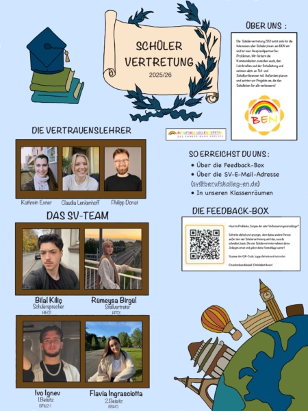 Wir, die Schülervertretung (SV) am Berufskolleg Ennepetal, sind eure Anlaufstelle für Verbesserungsvorschläge, Probleme oder einfach alles, was euch auf dem Herzen liegt. Wir haben immer ein offenes Ohr für alle Schülerinnen und Schüler.